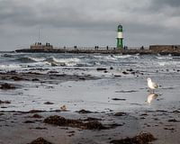 Een opname van het strand in Warnemünde met een meeuw op de voorgrond en de westmole op de achtergrond.