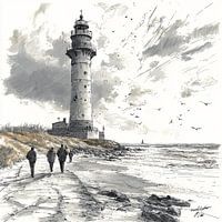 Een vuurtoren in een schetsachtig schilderij straalt rust en kracht uit. De hoge, cilindervormige toren staat trots op een rotsachtige kust, omgeven door ruige golven en een winderige hemel. Met losse, expressieve lijnen vangt de kunstenaar de beweging van het water en de eenzaamheid van de toren, als een symbool van houvast en richting.