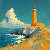 Een vuurtoren in een schetsachtig schilderij straalt rust en kracht uit. De hoge, cilindervormige toren staat trots op een rotsachtige kust, omgeven door ruige golven en een winderige hemel. Met losse, expressieve lijnen vangt de kunstenaar de beweging van het water en de eenzaamheid van de toren, als een symbool van houvast en richting.