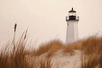 Een rustig vleugje nostalgie omringt de glanzend witte vuurtoren, die majestueus oprijst uit de glooiende zandduinen. Omringd door de warme zeebries en gouden grassen lijkt het een eenzame schildwacht die het geheim van de kust bewaakt. Zijn zachte licht zoekt de verloren zielen van de nacht.