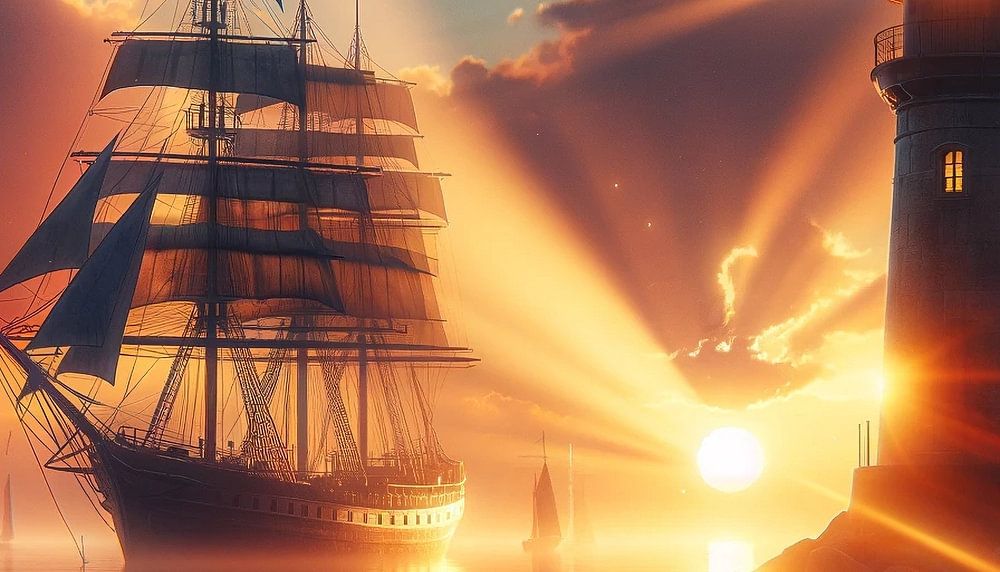 Deze foto lijkt uit een andere wereld te komen, waarin het laatste licht van de ondergaande zon een vuurtoren en een passerend zeilschip in een magische gloed hult. Het tafereel straalt een vredige rust uit terwijl de natuur haar dagelijkse handelingen verricht. De vuurtoren, die fier en stevig op zijn rots staat, is een symbool van leiding en veiligheid voor de zeelieden, terwijl het schip, gedragen door zachte golven, de haven lijkt te bereiken. De zonnestralen breken door de wolken, schilderen stralen in de lucht en weerspiegelen in het kalme water, waardoor het moment onwerkelijk en tijdloos lijkt.