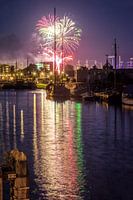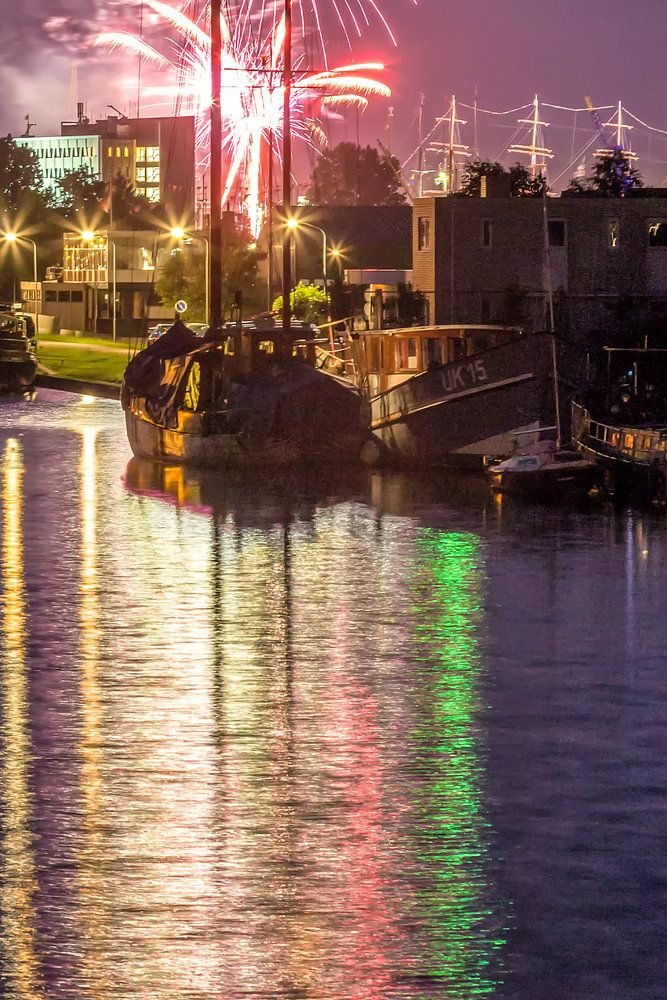 Vuurwerk tijdens Delfsail 2016 te Delfzijl Groningen, met reflectie in het water, vanaf de brug in de Hogelandsterweg over het Oude Eemskanaal. De afbeelding is in portretstand.