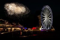 vuurwerk bij de pier in scheveningen, met reuzenrad op de voorgrond