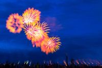 Foto van vuurwerk boven Nijmegen tijdens de vierdaagsefeesten, genaamd 'de Waal in vlammen'. Vier seconden belicht, tijdens belichting de focusring van 1 meter tot oneindig gedraaid.