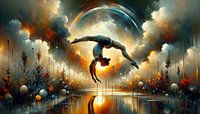 In dit dramatische beeld is een danseres vastgelegd te midden van een spectaculaire scène die een gepassioneerde dans in de zonsondergang illustreert. De danser, die een gewaagde sprong maakt, wordt omringd door een golf van warme kleuren en lichten die de hemel vullen. Deze artistieke afbeelding combineert de rauwe energie van de…