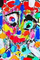 De gelaagdheid zorgt ervoor dat je steeds iets nieuws ontdekt: een verborgen lijn, een kleur die verscholen zit, of een onverwachte vorm die ineens een gezicht blijkt te zijn. Het is abstract, maar er zit een vrolijke brutaliteit in, een portret dat niet braaf wil zijn maar schreeuwt om aandacht.