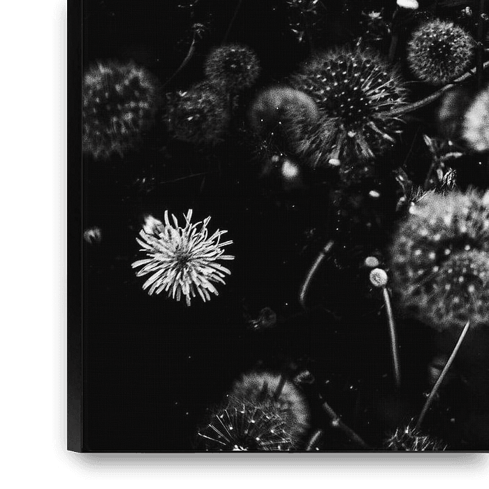 Een veld met deel uitgebloeide paardenbloemen is verandert in een donkeren lucht vol vuurwerk. Je kunt blijven kijken en nieuwe dingen ontdekken in deze foto. Het zwart neemt je mee de diepte in. Wat zie jij?