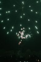 Vuurwerk word afgeschoten in de lucht en geeft een mooi effect. De hemel is mooi verlicht door de grootte van het vuurwerk wat afgeschoten was.