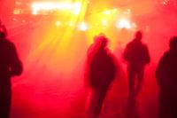 mensen wandelen in de nacht naar fel oplichtend oranje licht dat lijkt op vuurwerk. Hun vage, onscherpe schaduwen steken schimmig af tegen het licht. Gemaakt tijdens het 2012 Glow festival in Eindhoven