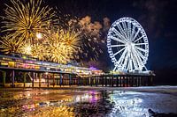 De show van Engeland met Pier en verlicht reuzenrad tijdens het Internationaal Vuurwerkfestival Scheveningen 2018.