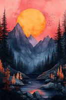 Een betoverend landschap waarin een enorme, vurige zon ondergaat achter majestueuze bergen. De warme oranje en roze tinten van de hemel contrasteren prachtig met de koele blauwtinten van de bergen en het water. Een rustige rivier weerspiegelt de gloed van de zonsondergang, terwijl dennenbomen en oranje vegetatie de oevers sieren. Een vlucht vogels in de verte versterkt het gevoel van sereniteit en natuurlijke schoonheid.