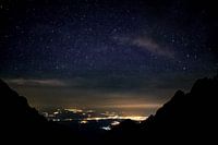 Sterrenhemel boven de door wolkenslierten bedekte vlakte, met zicht op de fel verlichte stad Poprad, gezien vanuit de bergen van de Hoge Tatra in Slowakije.