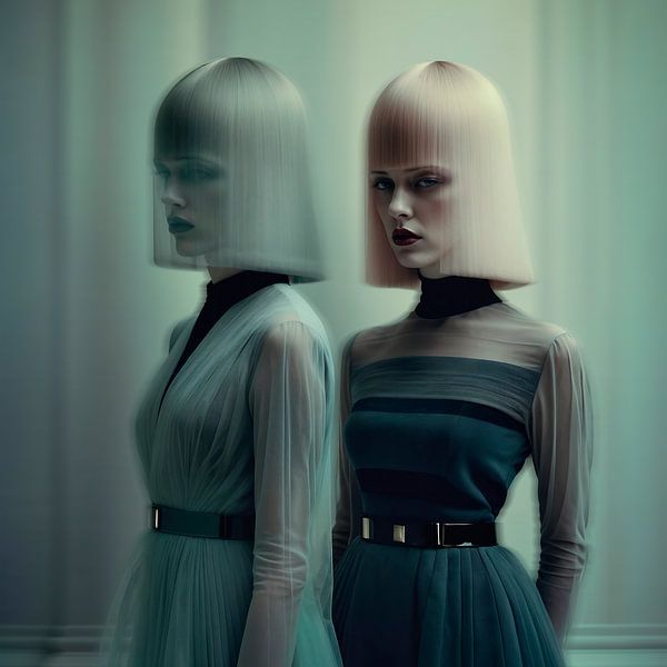 Twee figuren staan naast elkaar, de ene als een duidelijke aanwezigheid, de andere als een gedempte weerspiegeling of een nabeeld. Beiden dragen een strak, geometrisch bobkapsel dat lijkt op een helm. Pas bij nader inzien vallen de fijne details op: de transparante stoflaag over de schouders en armen, de rustige gelaagdheid van de…
