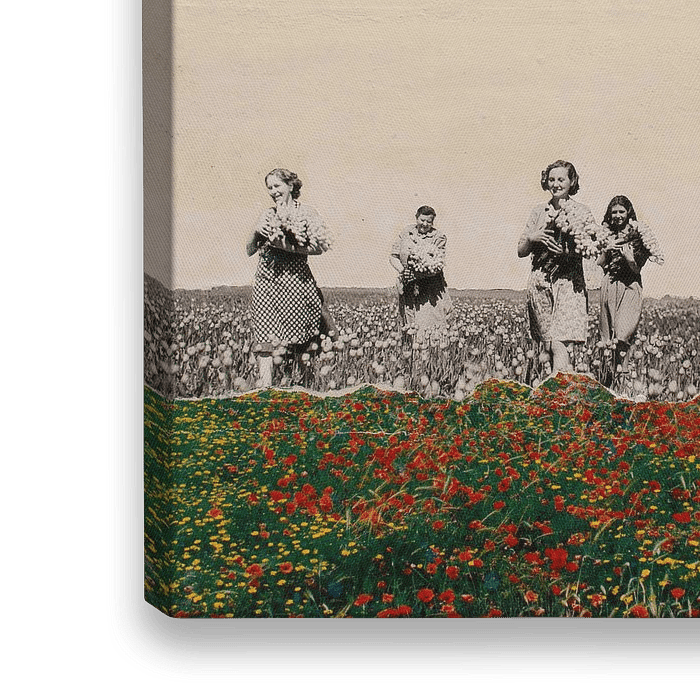 Een surreëel landschap met bloemen en tulpen in warme zomerkleuren. Mixed media en assemblage op papier. Mijn collages zijn opgebouwd met allerlei foto's, plaatjes en afbeeldingen die ik in de loop der jaren heb verzameld. Als eerste schilder ik een ondergrond met aquarel of acrylverf . Daarop wordt de collage in lagen aangebracht en soms weer losgetrokken om een oud en verweerd effect te creëren. Door de lagen over elkaar heen aan te brengen ontstaat een transparant effect, zoals alleen met aquarelverf mogelijk is. De eerste lagen zijn zichtbaar door de collage lagen heen. De meeste collages zijn bewerkt met acrylverf, in de vorm van stempelwerk of gewoon overgeschilderd. Daarnaast gebruik ik vaak een balpen of potlood om op de collages te tekenen.