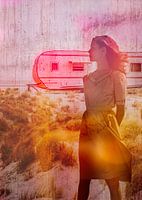 Dit landschaps kunstwerk toont een vrouw die op de voorgrond staat, uitkijkend over een verlaten duinlandschap. Er staat een  klassieke retro caravan, met afgeronde vormen en pastelkleuren die sterk doen denken aan de esthetiek van oude Polaroidfoto’s. De lucht en het zand zijn zacht vervaagd en tonen lichte verkleuringen, alsof het beeld zelf verweerd is door tijd en herinnering.