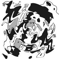 Een werk van Marijke Mulder. Zwart/wit. Surrealistisch beeld van figuren die elkaar op de hielen zitten, verward in een zwierige kluwe. Een humoristische verbeelding van het gevoel van angst. Net een stripboek.