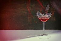 Een gebroken wijnglas met nog een bodempje wijn Tegen de achtergrond van een schilderij