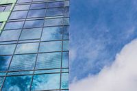 Het moderne hoge kantoorgebouw naast Arnhem Centraal station. Mooie blauwe en groene kleuren tegen een mooie bewolkte blauwe lucht.
