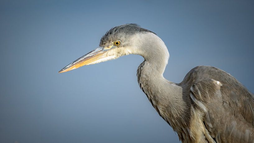 Een blauwe reiger staat aan het water van de ringvaart en houdt mijn in de gaten. Dat water is het blauwe op de achtergrond. De reiger stond daar doodstil, keek met een oog naar het water en mogelijke vis, en met het andere oog naar mij. Hij hield dus tegelijk twee dingen in de gaten, de vis voor de maag en mij voor zijn veiligheid. Ik…