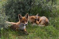 Jonge vosjes liggen in het gras wat te rusten, Echter een van de welpjes blijft alert en volgt me met zijn felle ogen.