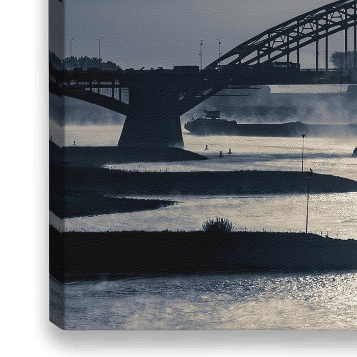 Ontwaakte meeuwen vliegen boven de mistige Waal bij Nijmegen. Twee boten varen onder de Waalbrug door.