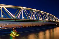 Nachtopname van de rivier de Waal bij Nijmegen. Op de voorgrond de spoorbrug met daar aan vast de fiets/voetgangersbrug De Snelbinder. Op de achtergrond de Oversteek. Linksonder zie je de lichtsporen van een politiebootje.