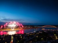 Vuurwerk boven de Waal bij Nijmegen. Elk jaar is er bij de Nijmeegse vierdaagse feesten een groot vuurwerk in de oudste stad van Nijmegen. Het vuurwerk wordt afgestoken vanaf de Waal of vanaf de oever van de Waal aan de Lentse kant. In de achtergrond is de Waalbrug nog te zien.