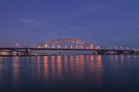 De bekende Waalbrug Nijmegen in het zogenaamde blauwe uurtje, net voor zonsopkomst of zonsondergang. Mooie weerspiegeling in het water van de lampjes op de brug.