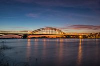 De mooie Waalbrug bij Nijmegen. Prachtige blauwe lucht met roze wolken net voor zonsopkomst. Blauwe uur optima forma.