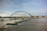De mooie elegante waalbrug De Oversteek bij Nijmegen is misschien wel de mooiste brug van Nederland. Tijdens hoogwater is het er werkelijk heel mooi. Deze foto is gemaakt bij het wandelpad over het stadseiland wat grotendeels onder water staat. De step-stones kun je nog oversteken met wat moed.