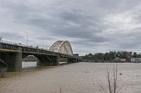 De Waalbrug in Nijmegen op een mooie winterdag tijdens het hoog water waarbij de uiterwaarden vol stromen met water uit de rivier.