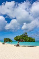Een perfect Caribisch en tropisch plaatje. De foto is geschoten op Eagle Beach, Aruba. Twee prachtige Fofoti bomen (vaak verward met Divi Divi bomen) staan op het stand aan de prachtig gekleurde Caribische zee.
