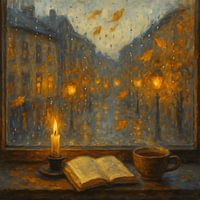 Waar Gedachten Dwalen vangt de intieme stilte van een regenachtige avond, wanneer de wereld zich terugtrekt achter glas. Op de vensterbank brandt een enkele kaars; naast het zachte licht ligt een opengeslagen boek en een kop dampende thee. Buiten dansen herfstbladeren in de regen, en de straatlantaarns weerspiegelen in het natte plaveisel als vlammen van herinnering.