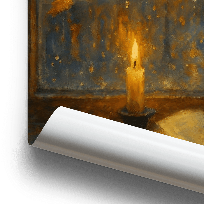 Waar Gedachten Dwalen vangt de intieme stilte van een regenachtige avond, wanneer de wereld zich terugtrekt achter glas. Op de vensterbank brandt een enkele kaars; naast het zachte licht ligt een opengeslagen boek en een kop dampende thee. Buiten dansen herfstbladeren in de regen, en de straatlantaarns weerspiegelen in het natte…