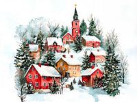 Een gedetailleerd aquarel schilderij van een schilderachtig, besneeuwd dorpje, verscholen tussen groenblijvende bomen. Het kleurenpalet bestaat uit zachte rode, gele, groene en witte tinten, die een serene en feestelijke winterse sfeer creëren. Het schilderij heeft een delicate, speelse kwaliteit, met zachte, vloeiende penseelstreken…