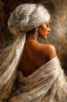 De vrouw, in half profiel afgebeeld, draagt haar zwijgen als een mantel. Lagen van doorschijnende stof omhullen haar lichaam en hoofd, niet om te verbergen, maar om te bewaren. De afgewende blik creëert afstand én intimiteit tegelijk: ze is aanwezig, maar ongrijpbaar. Het werk vertelt over waardigheid, identiteit en innerlijke kracht.…