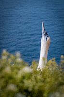 Deze Jan van Gent zit te wachten tot zijn (of haar) partner weer thuis komt. Op Helgoland ( een eiland in de Duitse bocht ) kan je heel dichtbij de vogels komen, zij storen zich niet aan al de mensen die komen kijken hoe ze hun nest bouwen en de eieren uitbroeden. Ze gaan gewoon hun gang, duwen elkaar van het nest , pikken eieren en nestmateriaal en verdedigen hun eigen nest met al hun mogelijkheden. Eten is dichtbij in de zee, en je kan aan de vogels zien of hun partner in aantocht is. Zoals bij deze vogel, die wist dat de partner snel ging landen met voer of nestmateriaal.