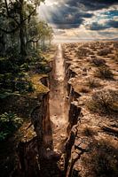 Een immense kloof splijt het landschap in twee werelden: leven en dorheid. Links baadt een weelderig bos in gouden zonlicht, terwijl rechts een uitgedroogde aarde barst onder een dreigende hemel. In het hart van de scheur botsen hoop en verwoesting in een adembenemend schouwspel van natuurkracht.