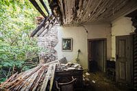 Een stille kamer in een verlaten Portugees huis keert langzaam terug naar de natuur. Waar een ingestorte muur en gebroken dakbalken de ruimte openstellen voor kruipend groen, bladdert de verf in lange, krullende stroken van het plafond. Diepe scheuren splijten het stucwerk, terwijl een zwaar houten bureau nog steeds staat, begraven…