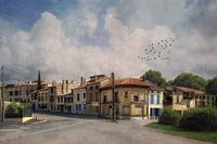 De zon hangt nog warm boven de daken terwijl het dorp langzaam tot rust komt. Luiken half gesloten, straten leeg, alleen het zachte geruis van wind tussen gevels.