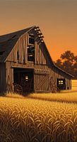 Dit kunstwerk toont een oude houten schuur die rustig naast een veld met goudkleurig graan staat, badend in de warme gloed van de zonsondergang. Het bouwwerk draagt zichtbare tekenen van ouderdom - verweerde planken, ongelijke texturen en eenvoudig gereedschap dat binnenin rust - maar het blijft geaard en waardig. Het omringende veld…
