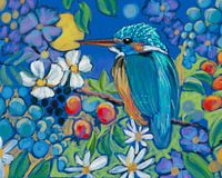 Dromerige vrolijk kleurrijk schilderij waar de ijsvogel centraal staat. Heerlijk houdt hij de omgeving in de gaten, tussen de bloemen en rozenbottels.