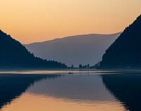 De zon zakt weg achter het fjord en laat het water oplichten in goud en koel blauw. Zachte overgangen van warm naar donker tekenen zich af in lucht en spiegeling. Alles komt tot rust.