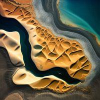 "Where the Desert Meets the Sea" toont een betoverende luchtfoto van een surrealistische ontmoeting tussen levendig woestijnzand en diep oceaanblauw. De vloeiende, organische patronen illustreren de dynamische interactie tussen land en water, waardoor intrigerende texturen en natuurlijke kleurovergangen ontstaan. Dit kunstwerk straalt…