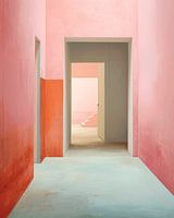 Waar gaan we heen?. Een modern werk in pastelkleuren van een doorgang die leidt naar een trap. Een werk met een verhaal en vraagtekens waar je niet snel op uitgekeken raakt.