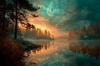 Aan de rand van een stil meer ontvouwt zich een boslandschap dat baadt in het zachte licht van een opkomende zon. De lucht kleurt in warme goudtinten die langzaam overvloeien in koel turkoois, terwijl wolken en bomen zich spiegelend verzamelen in het rustige water. Slanke dennen tekenen donkere lijnen tegen het licht en verdwijnen…