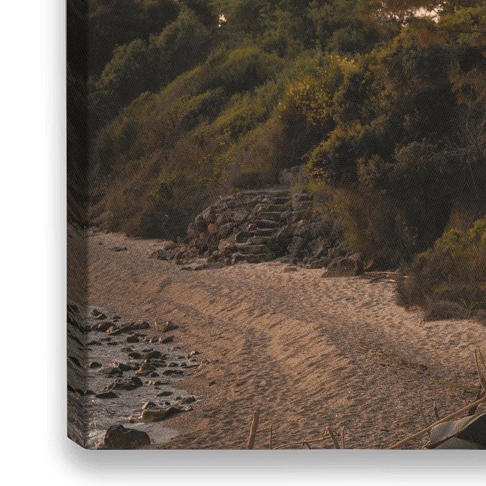 Aan de rand van het bos, waar de geur van dennen samensmelt met het zilte van de zee, ligt een smalle strook strand. De zon, nog laag aan de hemel, strijkt met gouden vingers door het lover en raakt de toppen van het zand, waardoor het licht in zachte banen langs de kust glijdt.