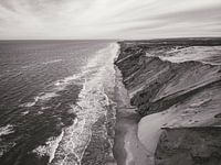 Deze opvallende monochrome luchtfoto legt de ruwe kracht van de Noordzeekust vast. De foto benadrukt de ingewikkelde texturen van steile, eroderende zandkliffen en de ritmische patronen van witgekapte golven die tegen een smalle kustlijn beuken. De afwezigheid van kleur benadrukt het schril contrast tussen de vloeiende energie van de…