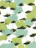 Luchtige, ritmische compositie van gestileerde bloemen in zachtgroene en mintblauwe tinten, verspreid over een heldere witte achtergrond. De bloemen lijken vrij te zweven of lichtjes te deinen, als in een zomerse bries. Ze zijn opgebouwd uit losse, dynamische penseelstreken die volume suggereren zonder in te boeten aan speelsheid of lichtheid.