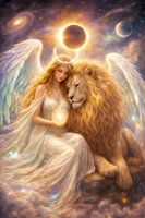 Dit handgemaakte kunstwerk toont een deva die liefdevol verbonden is met een leeuw, een krachtig symbool van moed, bescherming en hartkracht. De deva houdt licht in haar handen, als een bron van heling en bewustzijn, terwijl haar vleugels met aquablauwe accenten een sfeer van zachtheid, rust en spirituele zuiverheid…